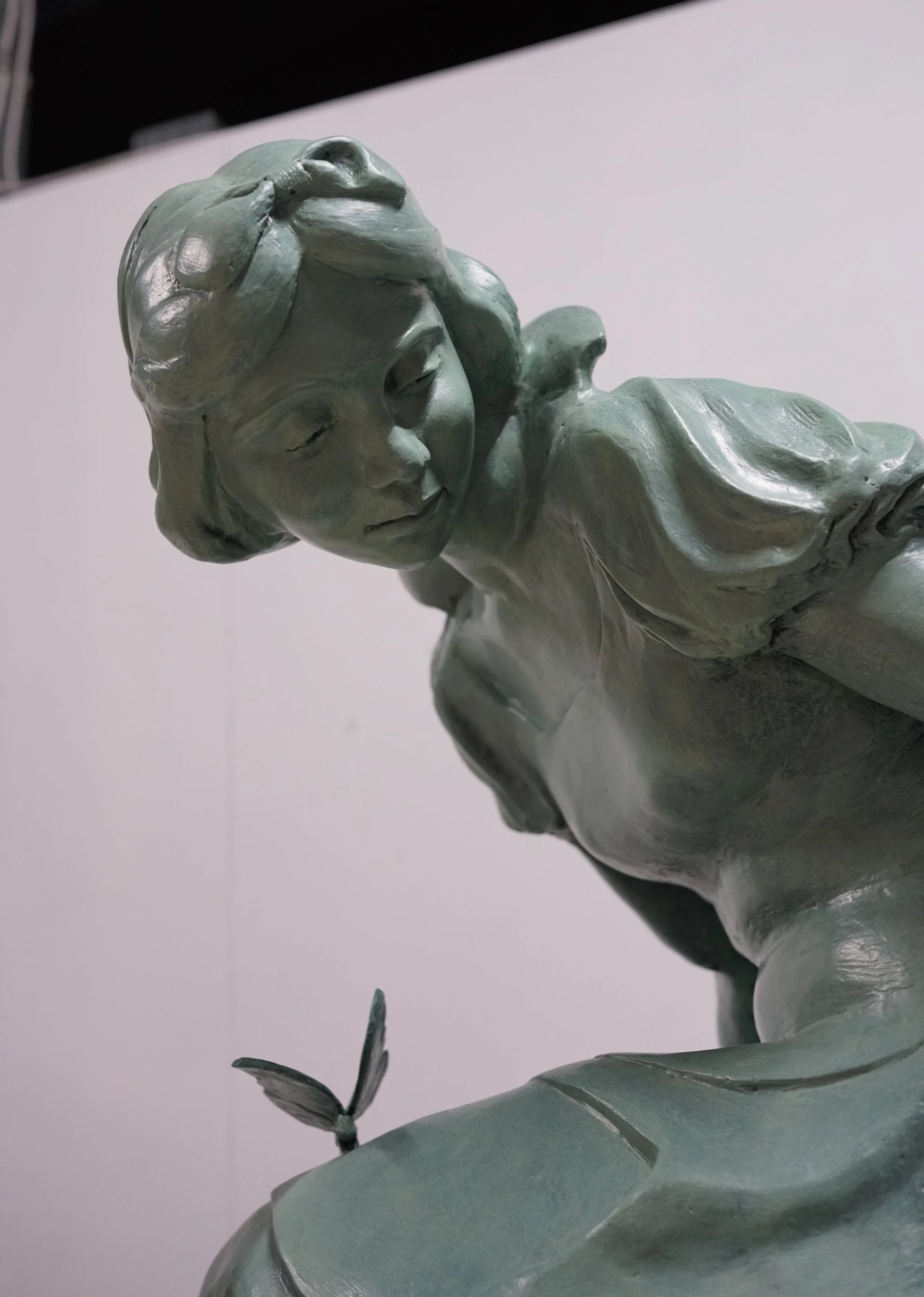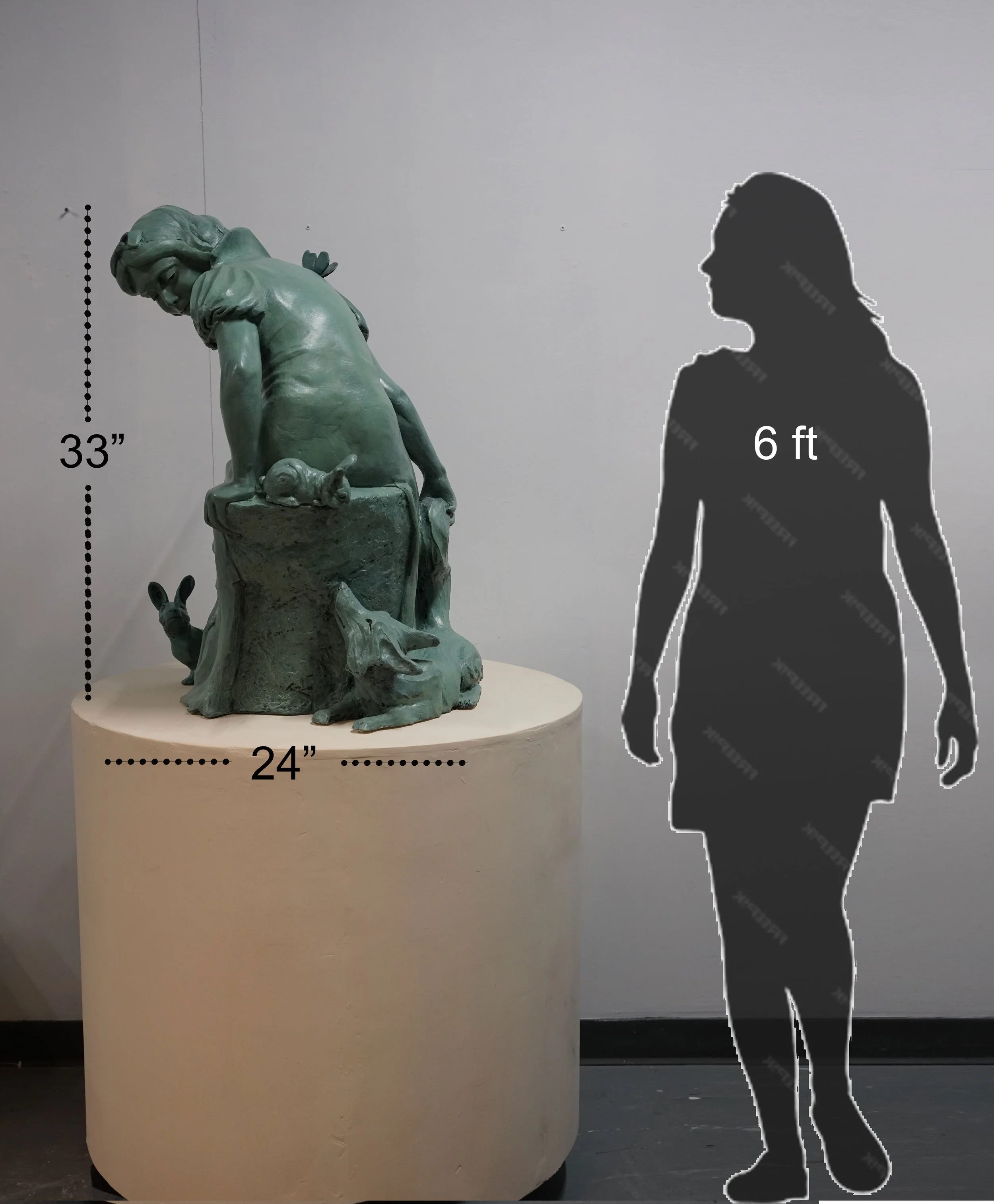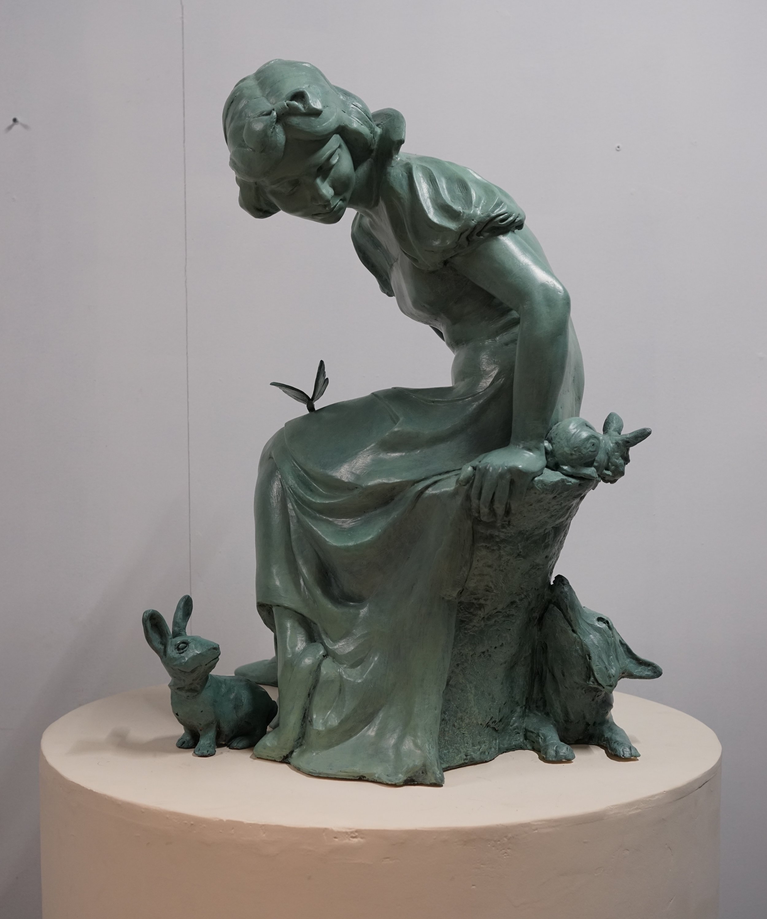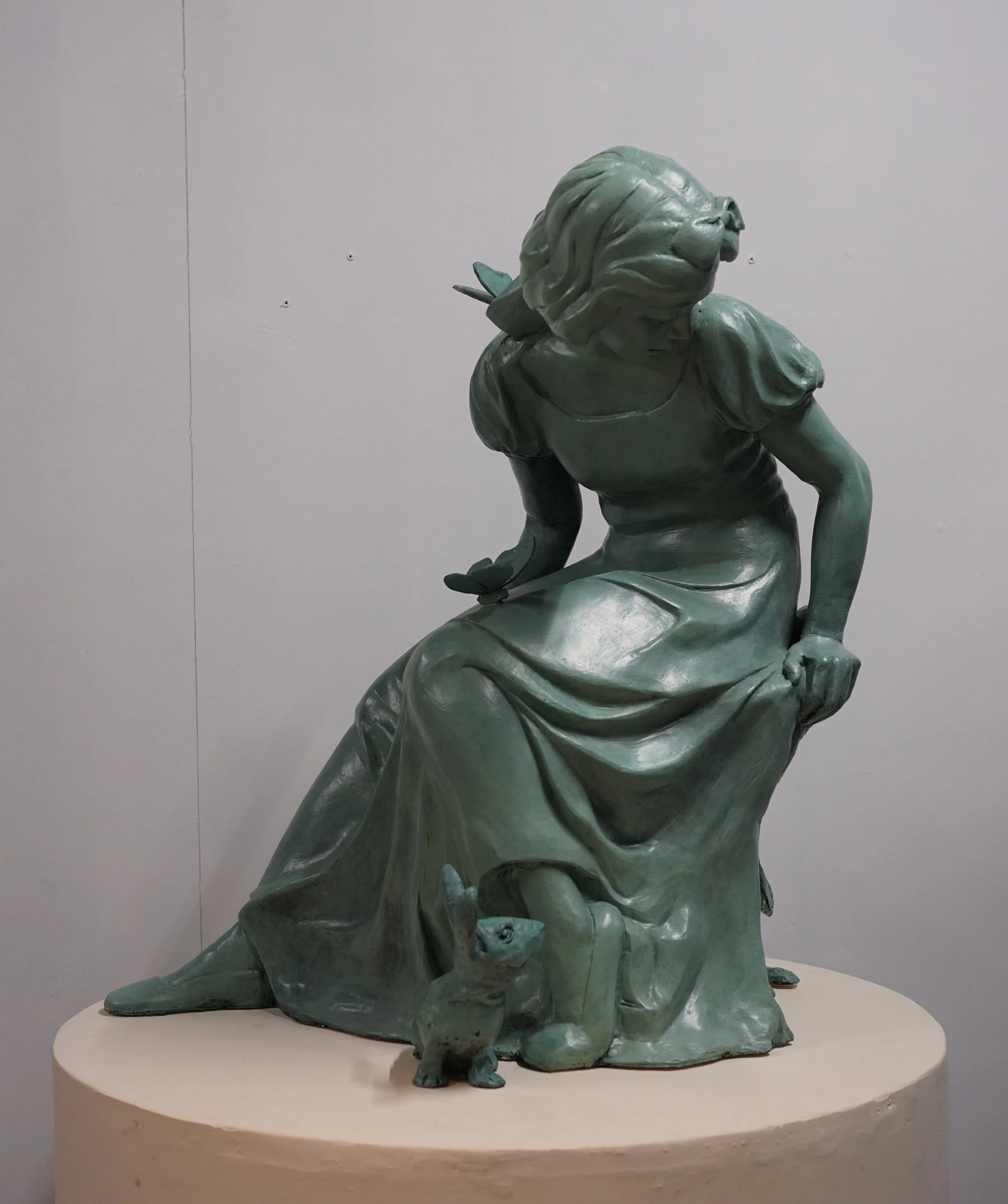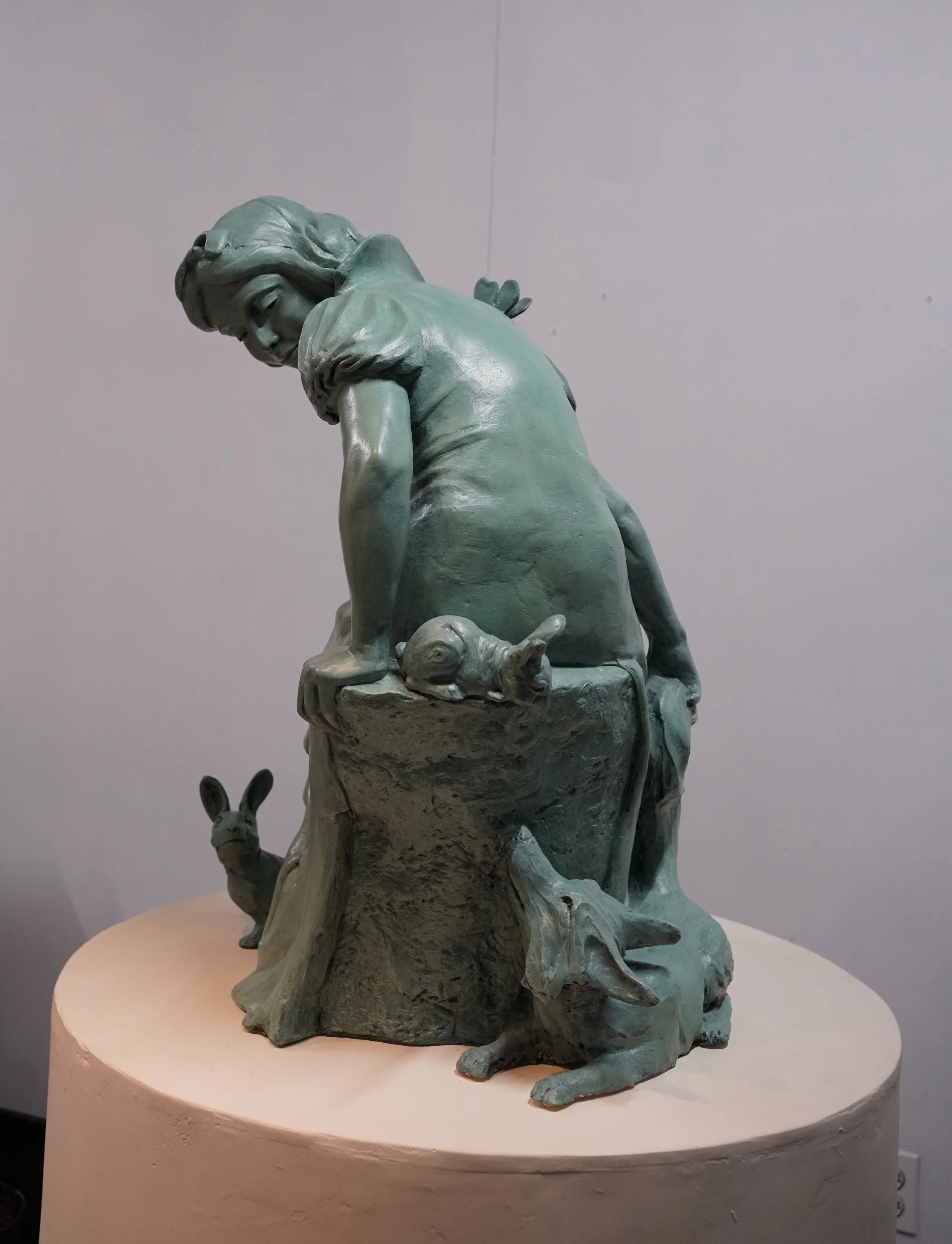 This sculpture shows the moment that a hero discovers her courage. Here, the Grimm Brothers fairy tale character Snow White has just escaped the huntsman, who has decided not to follow her evil stepmother’s orders to end her life, but still leaves her alone in woods filled with threatening beasts. Just when it seems like she should not survive, Snow White tames her predators and conjures up her own peace.