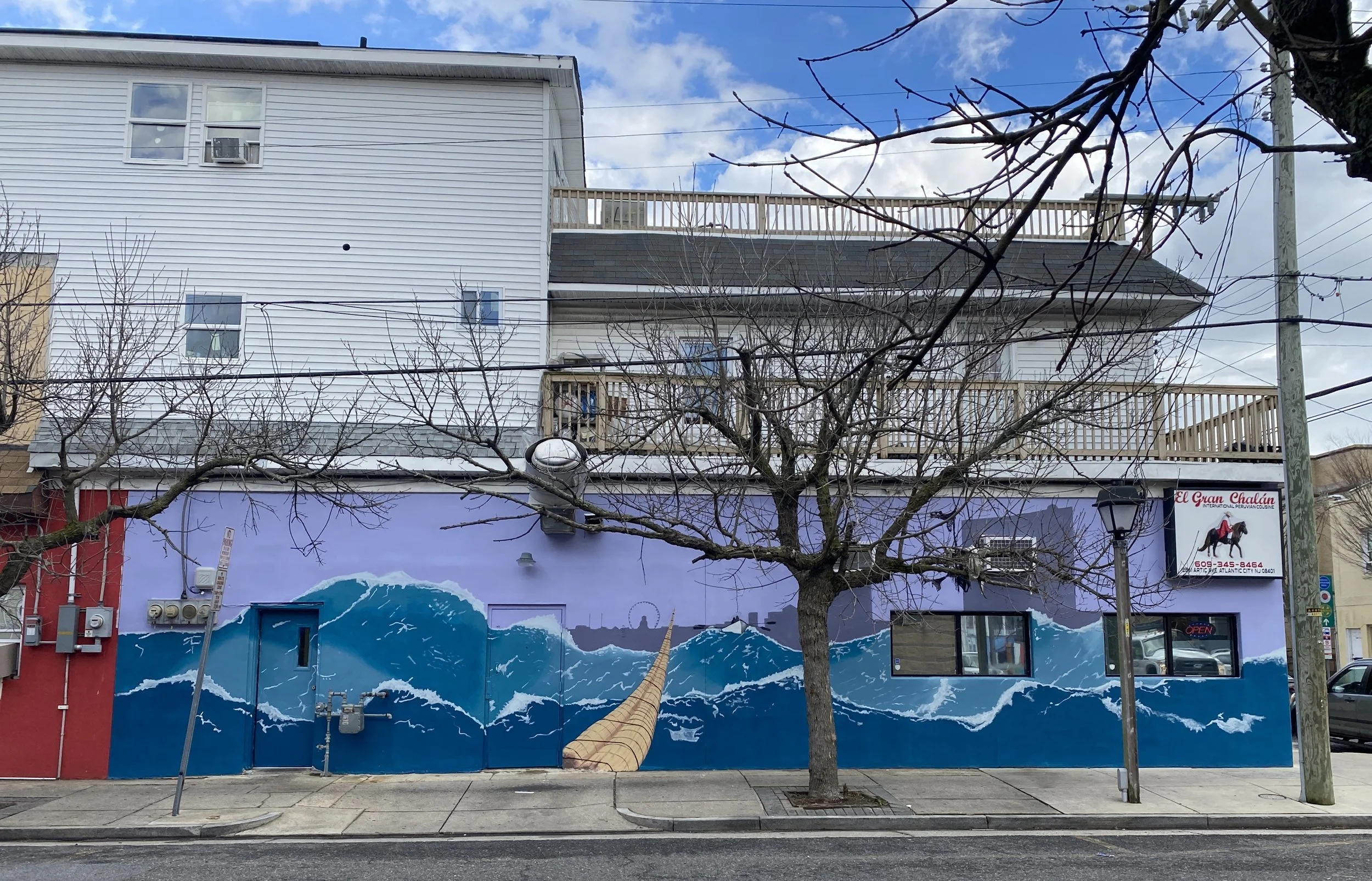 This mural shows a Caballito de Totora, a traditional Peruvian boat that has been built and passed down for 3,500 years and is still used today, meeting an Atlantic City lifeboat, a Van Duyne boat that has a long tradition for locals here. This scene features turbulent waves of change and redirection, but is grounded by the distant Atlantic City skyline. We hope the community can find themselves in the story of hope and adventure coming to this city and making it their home.
