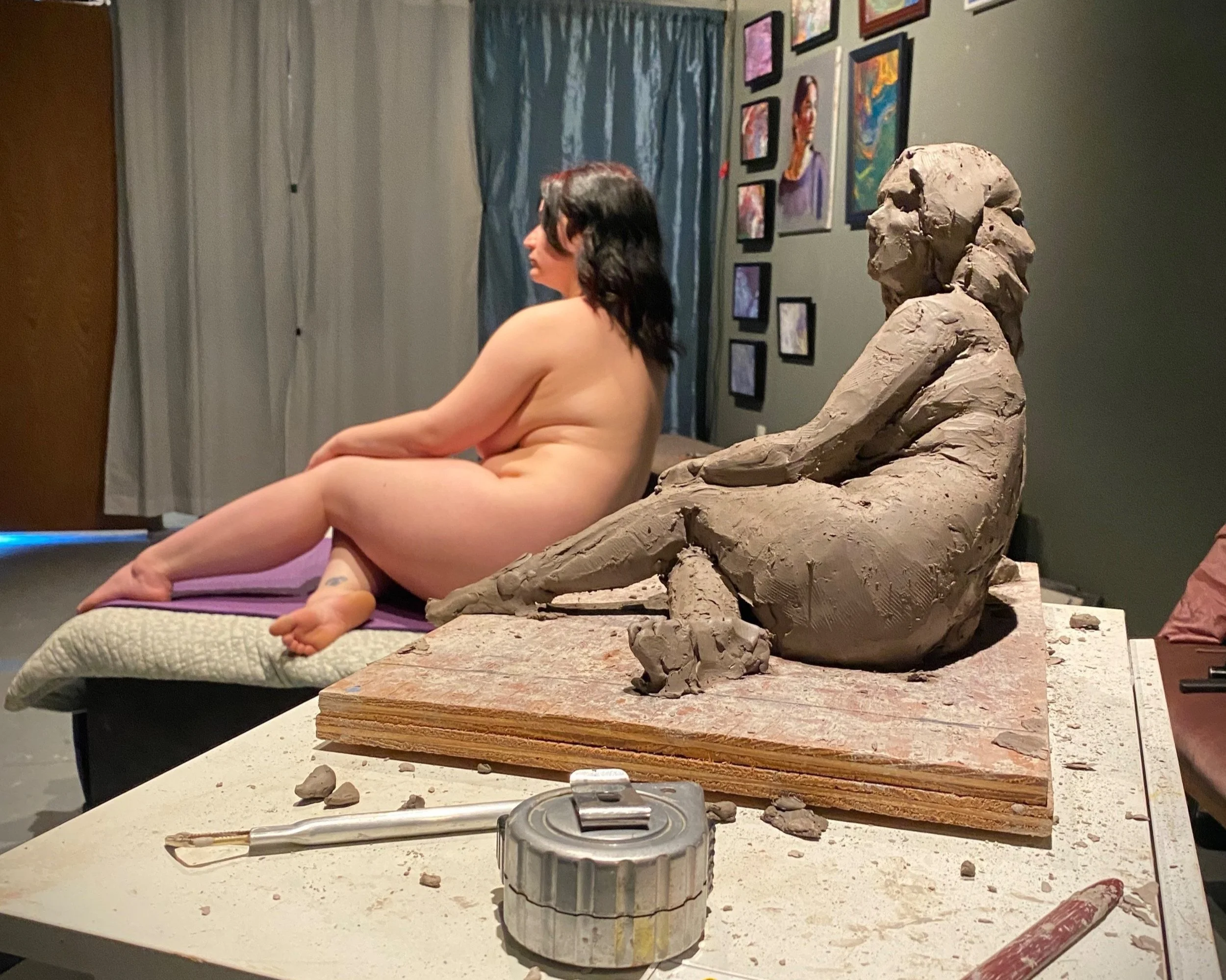 Immerse yourself in the art of figure sculpting with terracota water-based clay suitable for firing in a kiln. In this dynamic workshop featuring a live model, she will keep a dynamic pose for four days to create a small figure sculpture in water-based clay suitable for firing. This hands-on experience is designed for artists of all skill levels who wish to enhance their understanding of the human form, gesture and movement. Tools and clay is provided.
